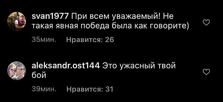 Шлеменко уверен, что одержал грамотную победу. В комментах на его странице поединок называют ужасным и стыдным