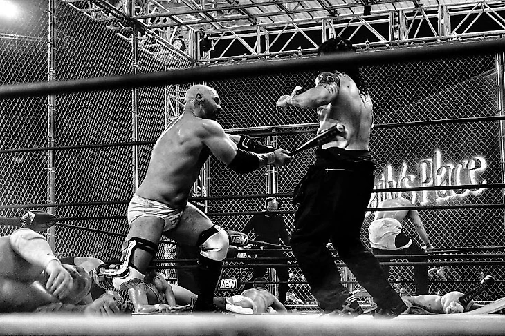 Удалось ли AEW показать War Games лучше чем у конкурентов? Нет. Потому что это был не War Games. Это был именно что Blood And Guts. War Games из NXT - это все таки про красивые и запоминающиеся споты. Про мунсолты с вершины клетки и сентоны с третьего каната на столы и сансэт парадайзы на стулья. Blood And Guts — он вообще не про это. Это не про выверенный полеты во сне и наяву. Это, в полном соответствии с названием, про кровь, кишки, рас….