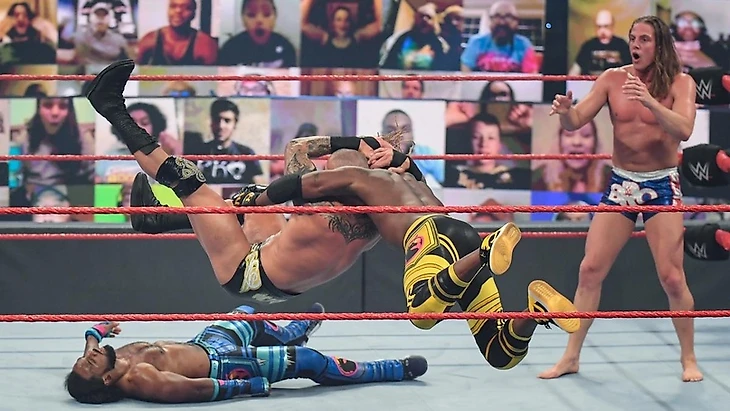 Перед этим матчем Мэтт и Кингстон с Вудсом в весёлой манере рассуждали о том, что случилось с каждым из них на прошлой неделе в командном дивизионе, связав всё с инцидентом об обстреле томатами в Ортоне. Сам Рэнди объявился внезапно, хоть его и раскрыл Риддл с помощью лиц Кофи и Ксавье, спросив того как его настрой. Ортон же сказал, что его способно развеселить: это завершение чьих-либо карьер, особенно если это легенда и после ударов по чужим головам. Реакция Риддла тут была просто на миллион долларов, ну и Кингстон с Вудсом хорошо это дополнили (Правда видеть Кингстона и Ортона спустя 1,5 года после их истории в 2019 году было тем ещё моментом, а уж хильская реакция "Гадюки" на несвязные речи Риддла однозначно доказала, что R-K-Bro - это современные Rock n' Sock Connection).