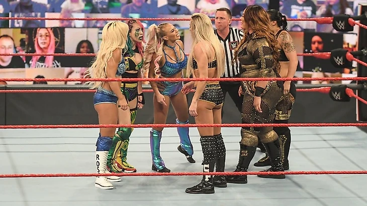 Плюс во время этого матча появилась Алекса Блисс и Лили, которые наблюдали с рампы за остальными, вызвав паузу в матче перед уходом на рекламу.