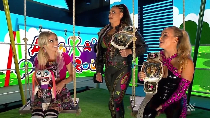 Алекса Блисс позволила своему Alexa's Playground вернуться в жанр некогда популярного Moment Of Bliss, пригласив Тамину и Наталью. Тамина была напугана антуражем этого места, а Наталья пыталась быть более дипломатичной. Вопрос от Алексы насчёт любимых цветов каждой из чемпионок немного разозлил Тамину, отчего Блисс и Лилли "расстроились". Впрочем Лекси тут сгладила углы похвалой того, как Тамина избивала Реджи на прошлой неделе - самоанка даёт понять, что готова это повторить, если Реджи попробует вмешаться снова. Данный ответ сподвиг Лекси рассказать об увлечении Лили - о коллекционировании крыльев и прочих конечностей мёртвых насекомых. Это стало последней каплей для командных чемпионок, которые тихо и практически незаметно покинули Блисс. Последняя же пожелала уже ушедшим дамам удачи в их титульном матче, говоря о том что будет с Лили наблюдать за ними.