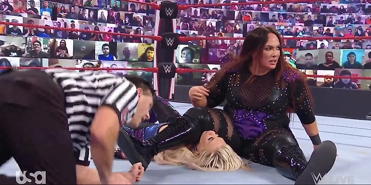 Второй ботч, можно сказать, вытекал из первого. То ли Найя пострадала от удара ногой в висок, то ли просто была очень неаккуратна, но итог был один: во время Shoulder Breaker Найя опустила на колено не плече, а нос Шарлот, после чего Флер еще и упала головой вниз на маты. Тут я спокойно признаю: второй ботч — ошибка Найи и только Найи, слава богу он не привел к травме.