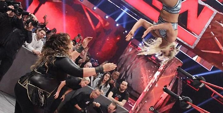 Первый произошел в середине матча, когда Флер решил отправиться мунсолтом за ринг. Найя, как и Тамина в случае с Вегой, не смогла рассчитать расстояние до Шарлот, из-за чего последняя прилетела лицом в пол практически с трех метров, Найя лишь поймала бутсы Шарлот своим виском. Этот случай я снова не готов записывать только на счет Найи, в мужском ростере Вполеты за ринг часто заканчиваются тем, что один реслер не ловит другого. Не зря же аутсайды называются Hight risk, так что винить только Найю нельзя.