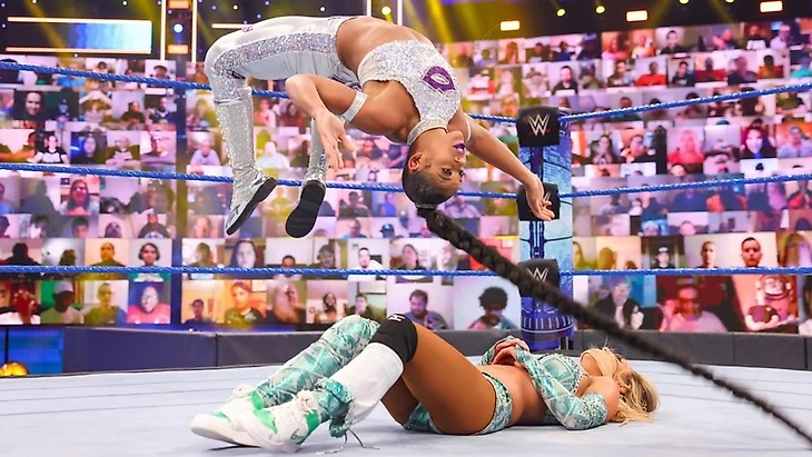 Начало боя было прервано появлением Бэйли прямо за спинами комментаторов бренда. Она присоединилась к Коулу и МакАфи, успевая хулиганить как в сторону Майкла Коула по старой памяти, так и в сторону Бьянки, называя Белэйр читером. Дошло даже до клички от Бэйли - мол это не Bianca Belair, а Bianca Be-LIAR (перевод думаю тут необязателен). Ну и парочка комплиментов от Бэйли в сторону Кармеллы также прилетело, но это уже условность.