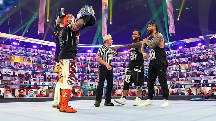 Победители: Рей и Доминик Мистерио по ДК, чемпионы сохранили титулы из-за атаки от Романа Рейнса.