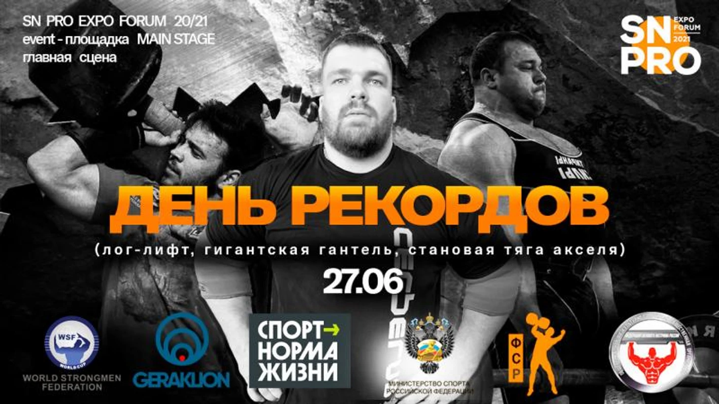 27 июня в Москве на VIII Международном фестивале ЗОЖ и спорта SN PRO EXPO FORUM 20/21 состоится турнир День рекордов. Организатор - Федерация силового экстрима России, при поддержке Федерации стронгмена России, фонда Гераклион и WSF. Ведущие мероприятия - Президент Федерации силового экстрима России Василий Грищенко и самый титулованный атлет России Михаил Кокляев.