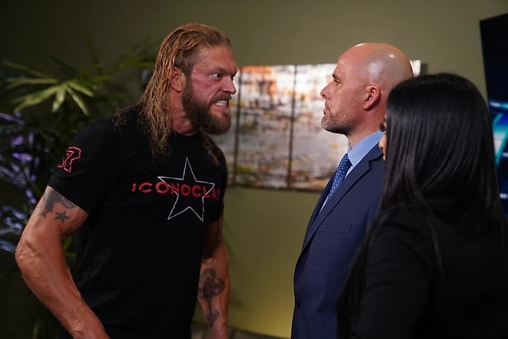 ... Объявился Эдж, что шокировало Рейнса - и оба развязали драку. Правда тут это выглядело как одностороннее избиение от агрессивного ветерана индустрии, если бы не мгновенный ответ от чемпиона в виде Superman Punch. Но промедление для Романа оказалось фатальным: пока он шёл за стулом для избиения Эджа, тот быстро пришёл в чувство и выбил стул из рук чемпиона. "Запрещённая Суперзвезда" решил взять в свои руки второй стул, чтобы нанести почти травмоопасный удар по голове Рейнса - этого не случилось из-за Джимми Усо, который выбежал на помощь Роману. Стычка между Усо и Эджем была короче драки с Романом - Джимми получил гарпун от канадца в баррикады и после этого не встал, а Рейнс с Хейманом оказались уже около рампы вдали. Эдж прямо кричал в сторону Романа, давая понять что он тут пришёл по его душу.