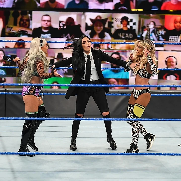 Но этот спич прервала Лив Морган с претензией о том, с каких пор подобные громкие заявления стали билетами для участия в матче за кейс MITB? Морган также указала на то, что она побеждала эту самую "красивую" девушку и что это куда более легитимный аргумент для места в матче за кейс для неё. Мелла парировала это тем, что она тут настоящая суперзвезда, но не Лив - это едва не спровоцировало драку между девушками, если бы не действия Сони. Сама Девилль отметила, что ей нравится настрой Лив и если она реально считает себя достойной занять место в лестничном многостороннем матче за кейс - пускай она докажет это в матче против Кармеллы снова. Бой начался после рекламы.