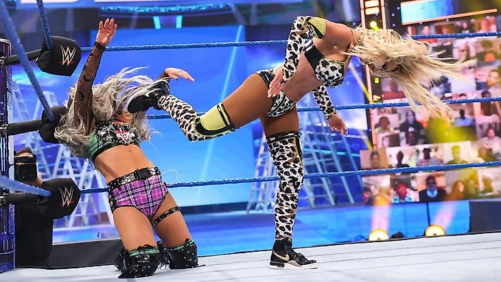 Победители: Сет Роллинс и Бэйли (победное удержание принесла Бэйли из-за хаоса между парнями во время попытки Белэйр провести финишер на Бэйли).
