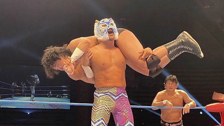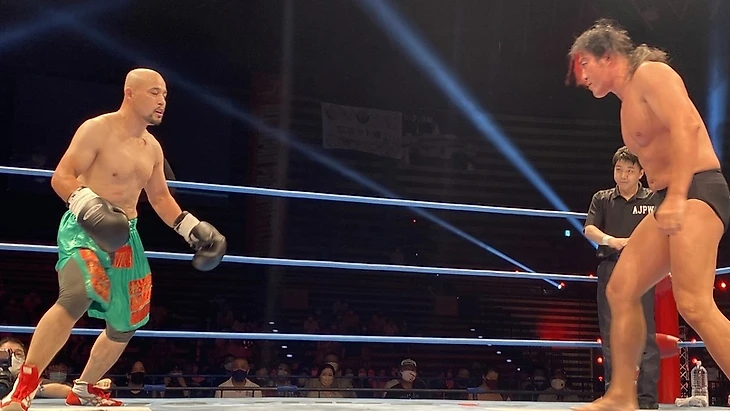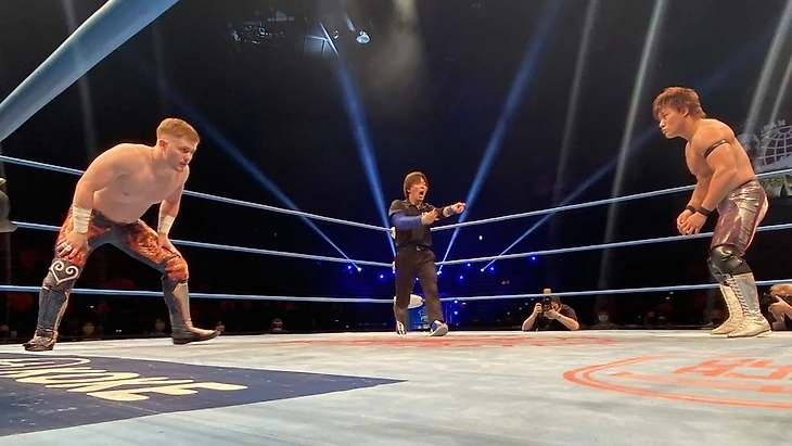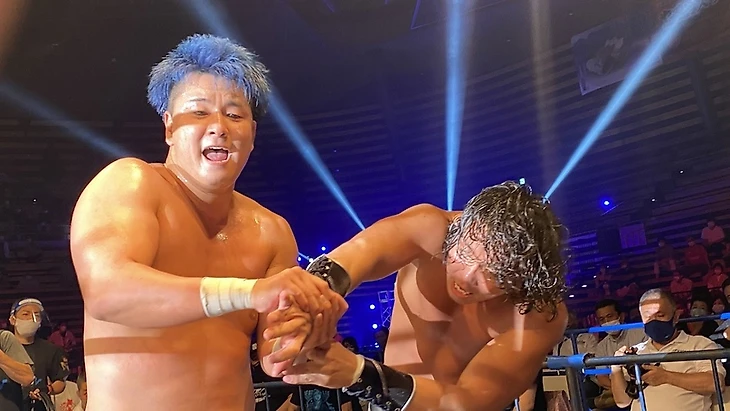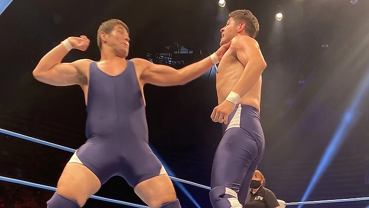 — После первого титульного матча, следующим боем стал специальный командник: TOTAL ECLIPSE (Кума Араши и Коджи Дой) против Шотаро Ашино и Рюки Хонды. Данный поединок стал заменой титульного боя, который планировался для Араши и Доя за командные мировые чемпионства AJPW против Кенто Мияхары и Юмы Аояги. Последние попали в большой титульный мэйн-ивент шоу, а Дою и Араши выделили других оппонентов в лице новой команды Ашино и Хонды. И честно говоря - тут я снова оказался разочарован: казалось что тут дадут рассказать историю о давнем факте предательства Ашино со стороны Араши и Доя, одних из давних знакомых и соратников, плюс и команда Ашино с Хондой образовалась на последнем дне Champion Carnival 2021 как факт продолжения той истории. Но на выходе - динамичный и довольно равный, однако чересчур короткий бой на 5 с чем-то минут, в котором TOTAL ECLIPSE победили чисто тактической выучкой и за счёт слабости Хонды как по-прежнему молодого выходца додзё AJPW. Ну и да - на суплексы Ашино можно смотреть вечно, прям по канонам Курта Энгла и остальных известных рестлеров-олимпийцев (Личная оценка - 2,75);