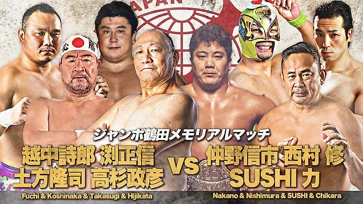 — Следом состоялся, так называемый в анонсе к шоу, поединок в память о Джамбо Тсуруте... в формате командника 4 на 4. В нём приняли участие: Масанобу Фучи, Масахико Такасуги, Рюджи Хиджиката и Широ Кошинака против Осаму Нишимуры, Чикары, Шиничи Накано и СУШИ. К чему был организован такой вот матч в честь одной из главных легенд AJPW мне не совсем понятно - тем более что наиболее близким коллегой и человеком в жизни Тсуруты из участников тут был только Масанобу Фучи. И почему тут не было таких людей как Йошинари Огава и Джун Акияма (которые по молодости своей карьеры были в составе группировки Тсуруты вплоть до смерти самого Джамбо) - я также не вкуриваю. А сам матч выдался ну чисто как развлекаловкой для нестареющих душой ветеранов индустрии, победила же команда Фучи (Личная оценка - 2,5).