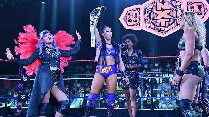 Нам показали, что после матча за женские командные титулы NXT появился Декстер Люмис, который унёс с собой Инди Хартуэлл.