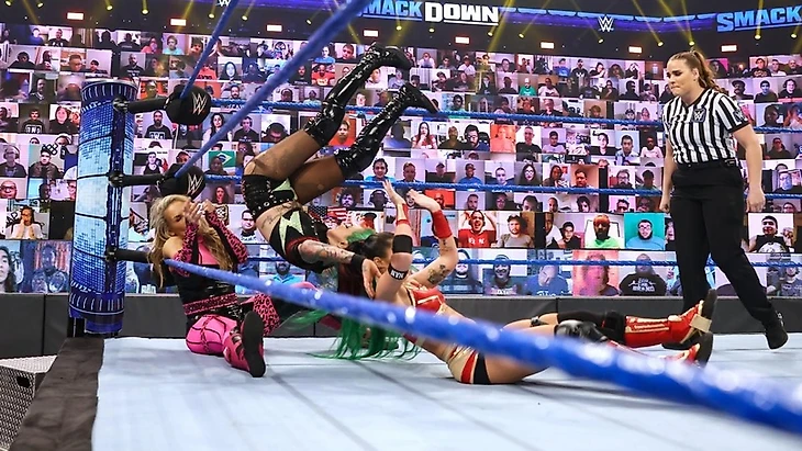 — На ринге появилась Соня Девилль для специального заявления вокруг событий Money In The Bank. Во-первых она официально объявила о том, что Бэйли получила травму во время своей подготовки к матчу против Бьянки Белэйр и данная травма выводит её из строя на 9 месяцев. Отсюда простой вывод: Бэйли снимает свою кандидатуру как оппонентки женской чемпионки синего бренда и Белэйр получит нового соперника. Соня показала послание от Бэйли, в котором та упрекнула зрителей в том, что её "сглазили" именно они - ведь она готовилась к своему большому моменту и собиралась показать себя во всей красе перед зрителями. Собственно ей также всё равно на то, кто окажется её заменой, так как никто не сравниться именно с ней. После завершения послания Девилль официально объявила о переносе титульного матча с PPV на первый выпуск Смэка при живой публике, который пройдёт перед самим MITB 2021. И что оппоненткой Бьянки Белэйр станет Кармелла. Последняя появилась на ринге в довольно горячем красном платье и сразу же поблагодарила Соню за такую возможность для неё, хотя она забыла о главном - о том, чтобы назвать Меллу самой красивой женщиной WWE.