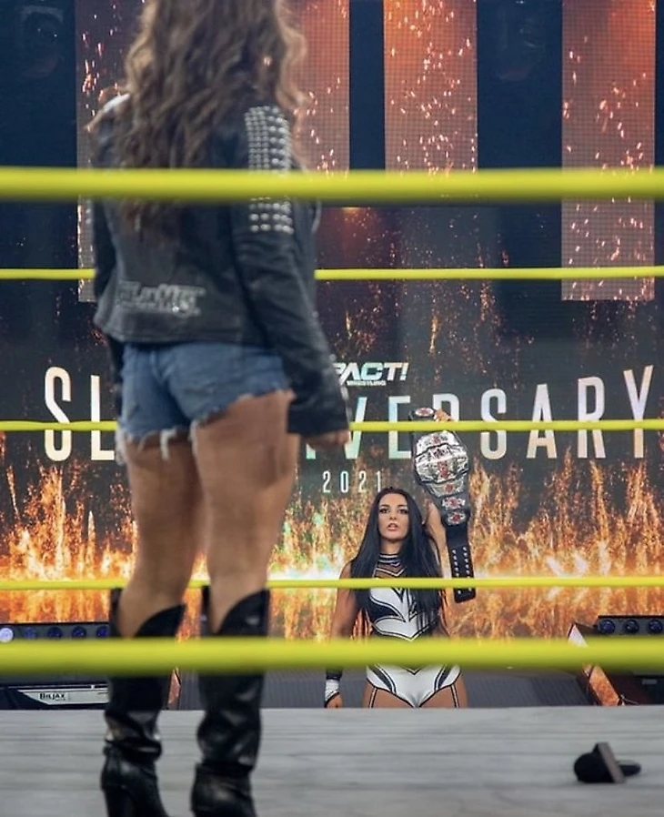 Что в целом символично - именно год назад Пурраццо начала свой путь в IMPACT именно с победы в титульном матче за главное женское чемпионство, победив Джординн Грейс. И не принимая в расчёт паузу между рейнами, Пурраццо осталась с титулом на протяжении всего года, одолев каждую в женском дивизионе IMPACT. А таинственным оппонентом "Виртуозы" стала... бывшая женская мировая чемпионка NWA и рестлерша NWA на данный момент Тандер Роза.