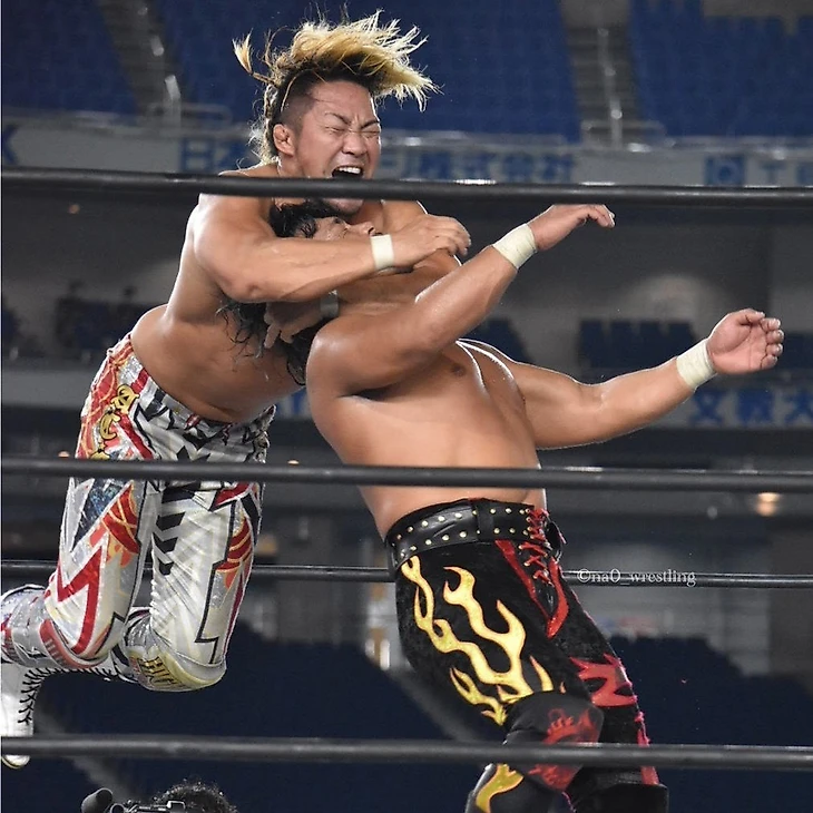 Открывающий матч основного шоу, который вышел весьма симпатичным. Рокки Ромеро впервые с конца февраля 2021 года выступил в Японии, а учитывая то, как выглядит командный дивизион полутяжеловесов NJPW, вторжение Mega Coaches в титульную гонку воспринимается как глоток свежего воздуха. Однако, «на бумаге» бой выглядел предсказуемо: да, интересная, но проходная титульная защита BC. В общем, за 21 без малого минуту в матче было все, чего вы могли ожидать. И классическая комедия Рюске, и работа ветерана Ромеро, и типичная командная работа от Bullet Club. Самыми яркими эпизодами матча стали, наверное, момент, когда Фантазмо поднял напарника себе на плечи, но командная работа не удалась, и Тагучи провел Таиджи лэриэт, так что у Эль Фантазмо и Тагучи получился неожиданный Doomsday Device, и шикарный мунсолт канадца после прогулки по третьему канату на оппонентов, стоявших за ограждениями. Был эпизод и классического для Фантазмо подражания бывшим лидерам Bullet Club. Ромеро пришлось вырываться после Styles Clash, получать V-Trigger и реверсировать попытку One-Winged Angel. Претенденты в какой-то момент на это ответили синхронными болевыми, когда Ишимори прошлось предотвращать попытку сдачи своего напарника. Вся эта красота привела нас к концовке, когда Тагучи направил суперкик канадца в Таиджи, провел Blue Thunder Bomb, сорвал с Фантазмо ботинок, увидев, наконец, что стоит за Sudden Death. Он показал обувь противника судье, которого затем отвлек на себя, позволив Эль Фантазмо провести удар Рюске ниже пояса. CRII прошел, и Bullet Club защитились, а мы так и не узнали, что же скрывает в своем ботинке Фантазмо, что делает его суперкик настолько жестким.