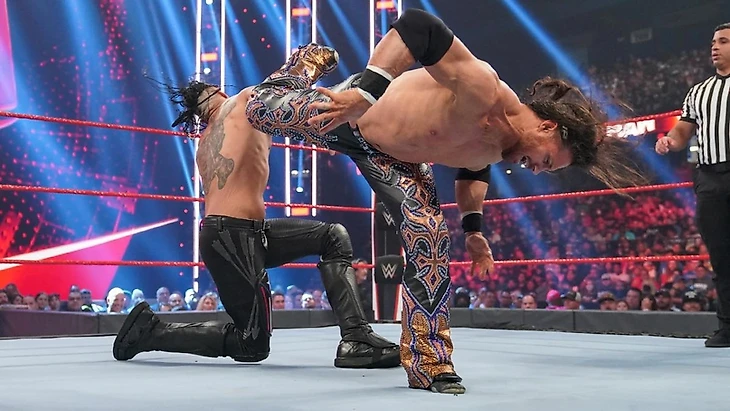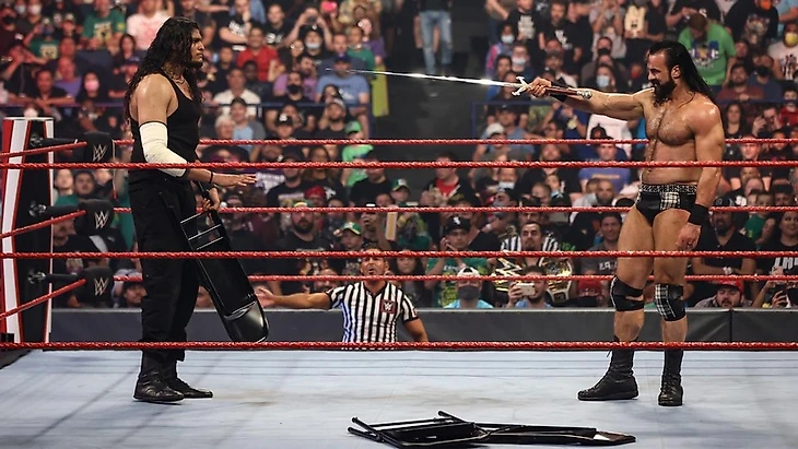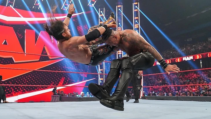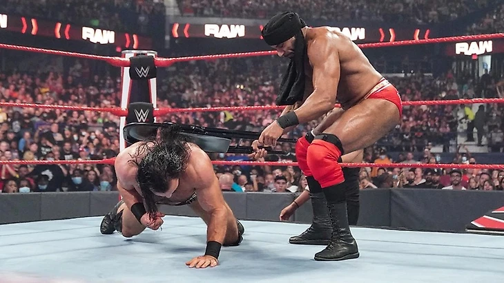 Я даже не знаю, с чего тут начать… Ладно, оставим в сторону все мои мысли на тему того, насколько можно серьезно воспринимать дуэль на стульях и бутафорском мече на шоу из категории «спортивные развлечения» в 2021 году, так будет проще. Что касается матча, то эти 3 минуты и матчем назвать сложно, да и вообще они были нужны чисто как сет-ап к разборкам после него. Это во-первых. Во-вторых, отдам должное WWE, ибо в отличие от прошлой неделе, на этой они сделали нормальную дисквалификацию в матче с Дрю. В-третьих, когда вся эта борьба 3 на 1 шла, я задумался, а не захотят ли нам организовать все-таки Punjabi Prison матч на SummerSlam, чтобы «изолировать» Махала 1 на 1 с Дрю. Но все-таки, я думаю, не сейчас. Скорее всего, нас будет ждать какой-нибудь матч со стульями, который МакИнтайр может еще и проиграть из-за вмешательств, а уже потом и Punjabi дождемся.
