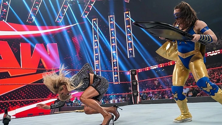 И она, от лица всех фанатов, хочет заявить, что чемоданчик Money in the Bank — это самый трусливый способ выиграть титул. Это не соревнование, а грабеж. С тех пор, как появился женский чемоданчик MitB, на ней кэшили не один, не два, а три раза. Говоря это, она закинула в ринг кендостик, стул и метлу, пообещав побить этим Никки. Кэш-ин на Флэр, по ее собственному мнению, это единственный способ создать себе имя в компании. На прошлой неделе она потребовала себе бой с Никки, чтобы доказать свое превосходство над той, кем все восхищаются, что она и сделала. И после этого у ЭйЭсЭйч хватило смелости, заявить, что она может победить Флэр? Шарлотт пожала ей левую руку, оставив правую свободной, чтобы нанести удар. И своим ударом она показала, что никакой уверенности в себе у Никки нет, она не чемпион вообще и все в таком духе. Сегодня у дам матч без ограничений, в котором нет ни дисквалификаций, ни отсчетов, да и спрятаться от Флэр чемпионка не сможет, поэтому она принесет себя в жертву. Шарлотт собирается… мы никогда не узнаем, что она собирается, потому что Никки залетела в ринг и нанесла «Королеве» удар стулом по спине. Флэр укатилась за ринг, дамы посмотрели друг другу в глаза, а мы едем дальше.