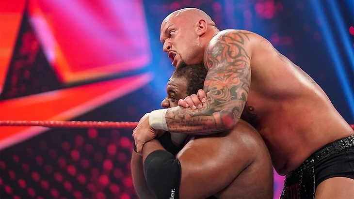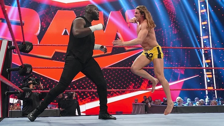 Нам напомнили о том, как Омос сломал самокат, Риддл проиграл Моррисону, а потом Стайлз провел «Бро» Клэш. В интервью перед матчем Омос сказал, что сначала он сломал самокат Риддла. Следующим будет позвоночник Мэтта. Риддл налетел на оппонента еще до гонга, применив rear naked choke. Здоровяк без особых проблем просто сбросил его с себя. Гонг прозвенел, и Мэтт ушел от атаки в углу, начав наносить удары предплечьем… но в итоге Омос схватил его за горло и выкинул за пределы ринга. Тут он направил «Бро» в зону тайм-кипера. До конца отсчета Риддл вернулся в ринг, но продолжил получать. Тэкл на апроне отправил его обратно к тайм-киперу. В очередной раз вернувшись в четырехугольник, Риддл зашел на серию ударов коленом, один вообще с канатов провел, но Омос все это «впитал», проведя очередной тэкл. Chokebomb, и командный чемпион победил.