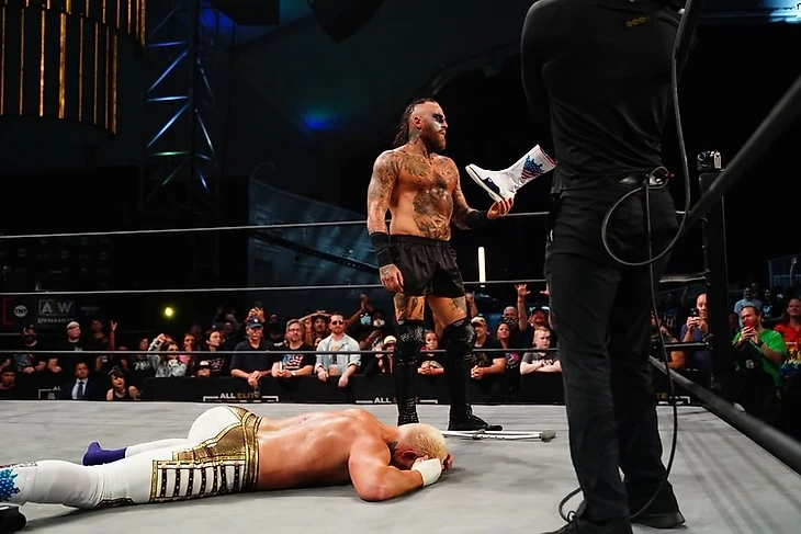 Коди сказал, что наследие — это странная штука. В15 лет попал в рестлинг, тренировался, работал судьей. Тогда он мечтал о титулах. Он хотел выиграть чемпионство, которое отобрали у его отца на MSG. Это была его цель. Но время летит. Цели меняются. Однако, он здорово повеселился. Интервьюер помог ему подняться, Роудс отказался пользоваться костылем, пожал Тони руку, сказал, что чувствует себя нормально, дав понять, что хочет остаться на ринге один. У него была цель, но затем беспрецедентная штука случилась. Он ушел из WWE, а не «его ушли», и он не знал, что будет дальше. Потом он встретил Кенни, Мэтта и Ника. И 3 года назад люди смеялись над ними, когда эта четверка говорила, что совершит революцию. И что в итоге получилось? AEW стали не просто альтернативой, они стали теми, с кем соревнуются. Они накрыли стол, и возможно, это настало время для кого-то нового есть с него. 3 года лицо Роудса было везде в AEW. Ему повезло в этом смысле. А теперь, возможно, в жизни Коди появились другие интересы, помимо рестлинга, может быть, разборки среди руководителей AEW, и возможно, эти парни не знают, но Роудс всем сердцем любит их. При всем уважении к названию Daily's Place, Коди считает это место Амфитеатром AEW. И нет места лучше. Нет места лучше, чем это, и нет лучшего времени, чем сейчас. И Роудс говорит это с легким сердцем. Он благодарен фанатам до слез, ведь они сделали его жизнь особенной. После этих слов он снял с себя ботинок, явно давая понять, что заканчивает с рестлингом, затем собрался снять второй… но по спине его костылем ударил Малакай Блэк. На картине лежащего поверженным на ринге Коди и торжествующего Блэка Джим Росс пожелал нам спокойной ночи.