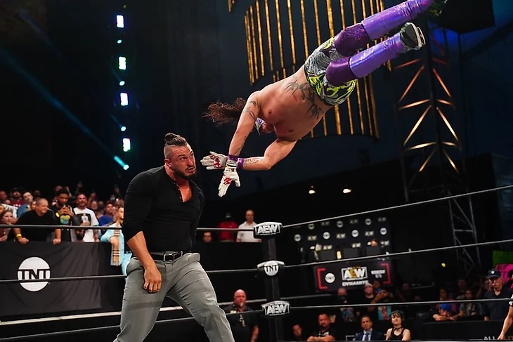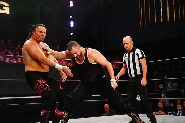 2.0 — это Ever-Rise, которых не так давно уволили из NXT. И в предзаписанном промо они сказали, что пришли из того места, где их недооценивали. Недооценили там и то, что Джефф и Мэтт (прямо как Харди) могут отправится в любое место, в какое захотят. Они, как и Гарсия, совершают сегодня свой дебют в AEW. Ну и сегодня их оппонентов не ждет ничего хорошего. Дарби к рингу сопровождал Стинг. Начали матч Дарби и Дэниел с чейн-рестлинга, обменялись попытками сворачиваний, Гарсия попытался выйти на суплекс — безрезультатно, и парень передал «члепой» тэг Мэтту, чего Эллин не заметил. Он попытался свернуть Дэнни, но тот направил его прямо под удар Ли. Довльно быстро Дари отбился, передав право ведения боя Кингстону. Эдди отвесил Мэтту несколько чопов, предварительнно «впитав» чоп от оппонента. Еще несколько ударов в углу обрушилось, Моксли помог напарнику помучить Ли, пока Кингстон отвлекал судью, но в итоге Джефф поймал Эдди ударом в спину у канатов. Естественно, Кингстон это не почувствовал и решил наказать Паркера, но вот чоп блок от Мэтта уже не оставил «Эдику» шансов. После этого дебютанты совершенно классически стали доминировать над Кингстоном, часто меняя друг друга в ринге. Наконец от Паркера Кингстон стал отбиваться чопами… и в итоге парни провели друг другу синхронные клоузайны. Самое время сменить составы, но Гарсия, пока Мэтт Ли отвлекал судью, прервал попытку передачи тэга Кингстона, чем очень разозлил Моксли. Джон атаковал Дэниела за пределами ринга и направил в ограждение. Эдди выкинул на рингсайд и Джеффа, которому оказывать помощь направился Мэтт… но столкнулся взглядами со Стингом. Он попытался поладить с легендой, и возможно у него получилось бы, если бы не суисайд дайв Эллина. Дарби вернул его в ринг, где Паркер получил энзигури от Кингстона, и составы сменились на Моксли и Гарсию. Джон принялся уничтожать всех троих соперников, провел Ли эксплекс, Паркер получил бэкфист от Кингстона, а Гарсия полетел на Моксли с третьего каната… и влетел прямо в Paradigm Shift. Тэг Эллину, Coffin Drop, Джон, Эдди и Дарби победили. Парни отметили триумф, а мы едем дальше.