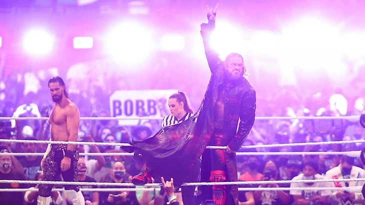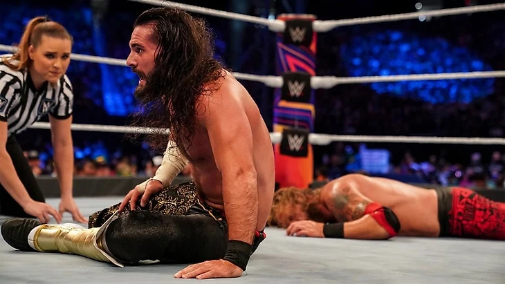 Снова член Зала Славы укатился от Стомпа на апрон, и тогда Роллинс попытался выйти на суперплекс, видимо, за пределы ринга, но Эдж это дело заблокировал, шарахнув некбрейкер с третьего каната! Не без труда рестлеры поднялись на ноги, Эдж провел еще один флэпджэк, на этот раз на канаты, лэриэт, серию страйков Edgecution, но и этого для триумфа оказалось недостаточно. Сет ответил флэтлайнером в угол ринга, но суперкик Эдж реверсировал в Edge-O-Matic до 2. Восхождение на третий канат Роллинс прервал, вышел на фирменную связку из суперплекса и фэлкон эрроу, опять же до 2. Стомп поять не зашел, как и Pedigree, а Эдж умудрился провести Glam Slam, сделав отсылку к своей супруге Бет Финикс, однако снова до 2, а затем Сет отбился у канатов, проведя жесткий некбрейкер на канаты. Стомп на апроне не прошел, Эдж впечатал врага в стойку ринга и зарядил гарпун за пределы ринга! Потом он еще и LED-экран потушил на апроне головой «Архитектора», но и этого для победы не хватило, а гарпун Сет встретил с помощью Pedigree. 1, 2, канадец продолжил борьбу в матче! Phoenix Splash цели не достиг, и Эдж шарахнул гарпун буквально из неоткуда, однако и в этот раз матч не закончился! Попытка, видимо, бэкслайд, но Сет реверсировал, проведя удар в затылок. Еще один. Суперкик от Роллинса. Но Стомпа канадец снова избежал, реверсировав в Edgecator! Сет ответил сворачиванием до 2, но попал в кроссфэйс. Роллинс хотел было реверсировать, но Эдж несколько раз жестко впечатал визави лицом в канвас, снова применил удушающий, и Роллинс сдался! Эдж победил в прекрасном поединке.