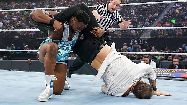 Корбин стырил у Биг И чемоданчик Money in the Bank, поэтому в последний момент нам назначили данный поединок на Kick-Off. Представляла рестлеров победительница конкурса WWE в TikTok на звание «лучшего ринг-анонсера» Рэйн Круз, а наблюдал за боем Логан Пол. Начал матч Биг И «за здравие»: пересилил противника в стартовой борьбе за инициативу, получил, правда, шоулдер тэкл, но почти сразу провел классический оверхэд белли-ту-белли и добавил бэк суплекс до 2. Казалось бы, ничего не предвещало беды, и представитель Нового Дня уложил противника на апрон для коронного сплэша… от которого Корбин ушел, так что И неприятно приземлился на самую жесткую часть ринга. После свидания со стойками ринга и за пределами четырехугольника, и внутри него, Корбин начал свое доминирование. Биг И пытался отбиться, даже реверсировал Chokebreaker в Stretch Muffler, но Бэрон отбился и поймал визави в Deep Six до 2. Поняв, что победить вряд ли получиться, Корбин покинул ринг, схватил чемоданчик и собрался уходить, но соперник встретил его жестким тэклом, отправив прямо в баррикаду. Биг И забрал себе чемодан, но Бэрон направил его в ограждение, снова завладев кейсом. В конечном счете, Корбин оказался на апроне, а И заскочил в ринг и шарахнул недругу коронный гарпун за пределы ринга! В четырехугольнике прошел Big Ending, и после такого, как известно, не поднимаются. В общем, Биг И победил, завладев, наконец своим чемоданом с контрактом.