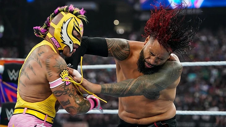 За кулисами Доминик извинился за то, что его действия стоили победы отцу на SmackDown, однако Рей сказал, что прошлое остается в прошлом, и сейчас нужно не извиняться за прошедший уже «Смэк», а настроиться на грядущий бой. Претендентов фанаты встретили вполне тепло. Начали бой Рей и Джимми. Обмен ударами закончился харриканраной от лучадора, после которой он решил зайти на 619, но Усо сбежал на рингсайд от этого дела. Джей попробовал вмешаться, но Доминик отправил и его за пределы четырехугольника к брату. Тэг Доминику, бейсбол слайд от Рея на чемпионов, а его сын провел симпатичный кроссбади с угла. Спрингборд хай кросс в четырехугольнике, но только до 2, после чего Дом зашел на 3 Amigos, но во время третьего суплекса Джей перехватил тэг у брата. Доминик зашел на фрогсплэш, но Джимми сбросил претендента за пределы ринга. Тут Дома впечатали еще и в стойку ринга, а по возвращении в четырехугольник, ему пришлось страдать от классического доминирования «плохих» парней. В какой-то момент Мистерио-младший почти отбился в углу от оппонентов, но получил очередной панч. Усо так комфортно себя начали чувствовать, что Джей зашел на собственную версию 3 Amigos, однако финальный Доминик перевел в симпатичный некбрейкер, передав после этого «горячий» тэг папе. Ему навстречу вышел Джимми, которого легенда луча либре назнес без особых проблем. Отличный Tornado DDT, но только до 2. Seated Senton, отличный кик, там где-то Джею даже досталось, но Усо внезапно шарахнул суперкик до 2. Тэг, попытка командной работы, но Рей отправил Джимми за пределы ринга, обменялся реверсами с Джеем… и влетел в суперкик со спрингборда! Uso Splash, но Мистерио вырвался. Double Uce прервал Доминик, попытавшись провести Джею суплекс на апрон, но сам получил фронт суплекс на самую жесткую часть ринга. Рей же умудрился увернуться от сплэша Джимми, подготовил визави к 619, который залетел, как и РК с апрона Джею. Фрогсплэш с отсылкой к Эдди Герреро, но Джимми успел поднять колени. Тэг Джею. Синхронный суперкик! Uso Splash от Джея, и после такого Рей вырваться не сумел. Титульная защита.