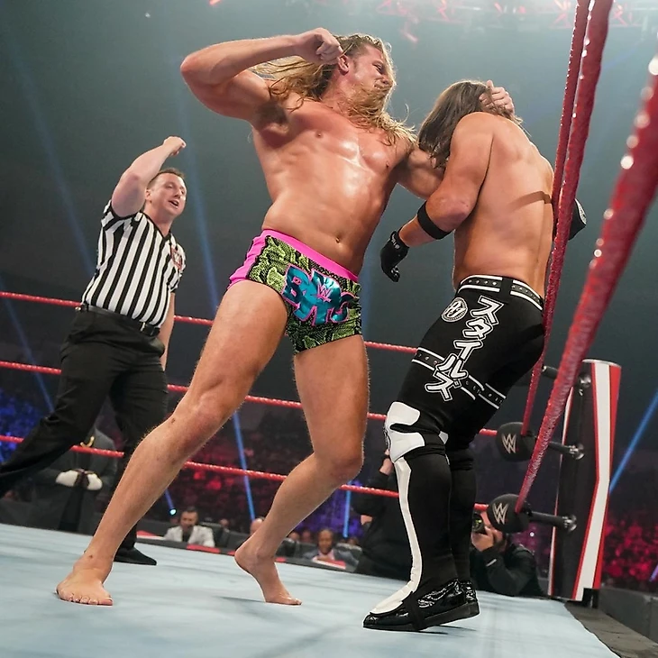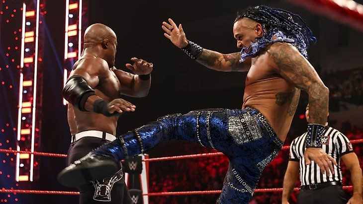 Чемпион WWE начал бой с мощного броска, и первое время доминировал, не гнушаясь грязью. Прист попытался отбиться, но получил флэтлайнер. Гарпун, правда, Дэмиэн встретил хай киком, отвесил серию страйков и «шлифанул» это дело лэриэтом. Попытка South of Heaven чокслэма, но к рингу выбежал Шеймус и атаковал чемпиона Штатов со спины. Вместе с Лэшли они принялись забрать Приста, но на арену выбежал Дрю МакИнтайр. Шеймус попытался его встретить на рампе, но получил лэриэт. В четырехугольнике он устроил размен ударами с Бобби, отправил чемпиона WWE за пределы ринга лэриэтом. Прист тем временем закинул Шеймуса лэриэтом в зрительский зал, а Дрю провел жёсткий оверхэд белли-ту-белли суплекс Лэшли на рингсайд, а потом и суплекс на стол. Очевидно, нас ждёт командник после рекламы. Что до результата, то Дэмиэн, получается, выиграл по дисквалификации.