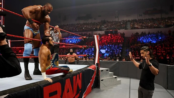 Во время выхода аравийца нам показали его предзаписанный диалог с Али в раздевалке. Мансур поблагодарил Мустафу за поддержку, однако сказал, что сегодня хочет выиграть чисто. Поэтому попросил товарища не вмешиваться в бой, что бы не случилось. Али, кстати, сопровождал Мансура к рингу. В углу Махала присутствовали Вир и Шэнки. Махал начал матч с доминирования и пресекания всех попыток камбэка, пока Мансур не отбился на апроне с помощью канатов и не провел хай кросс. Сразу после этого, правда, он нарвался на кик, и Джиндер провел пару атак и, пережив jawbreaker, шарахнул еще один кик. В итоге, Махал стал забивать соперника в углу, не слушая призывов судьи, из-за чего представителя Индии дисквалифицировали. Джиндер, тем не менее, остался доволен этим результатом. Мустафа же, поднялся на ринг и отчитал своего падавана, посоветовав тому забыть про «чистые победы» и начать уже прислушиваться к старшему.