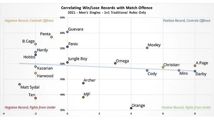 Как мы знаем, в реслинге есть как доминанты, то есть реслеры, которые большую часть времени контролируют ход матча, и андердоги, которые в свою очередь «отсиживаются в защите», полагаясь на неожиданные выпады. Собственно, снизу схемы мы видим тех, кто защищается и сверху тех, кто нападает. В то же время результаты матчей не зависят от того, кто как ведет бой: доминанты не всегда выигрывают, а андердоги не всегда проигрывают. Соответственно, в правой части схемы находятся реслеры, которые чаще одерживают победу, в левой же части чаще терпят поражение.