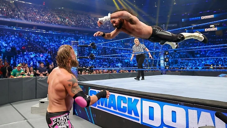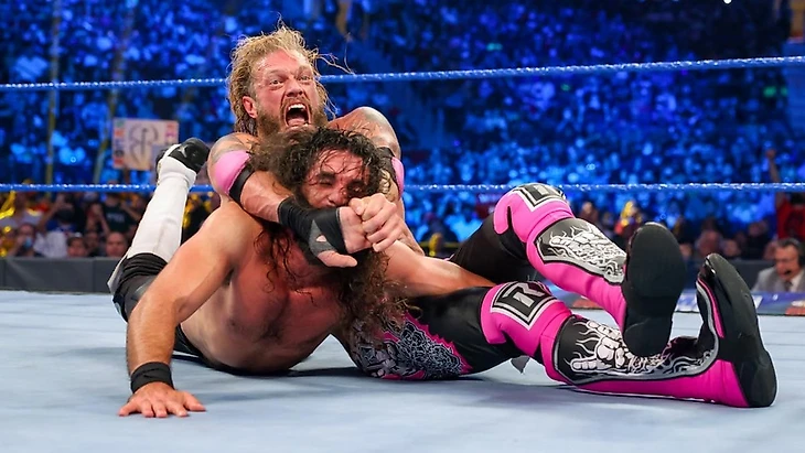 Публика тепло встретила Эджа, и рестлеры начали «упражняться» в чейн-рестлинге. На атаку руки канадец ответил хэдлоком, но получил дропкик в колено. Сворачивание от «Запрещенной Суперзвезды» до 2, и он нанес несколько ударов, избежав затем флэтлайнера в тернбакл, направив в него Сета, а потом еще и в стойку ринга плечом впечатав. Роллинс укатился за пределы ринга, куда и Эджа вытащил, впечатав в ограждение. По пути обратно в четырехугольник, ветеран атаковал соперника с помощью канатов, провел еще пару ударов, но при попытке, видимо, гарпуна, напоролся на колено. Колено в спину отправила члена Зала Славы за пределы ринга, куда Сет полетел суисайд дайвом. После рекламы мы увидели, что «Мессия» все еще доминирует и все еще на рингсайде. Спрингборд колено по пути в ринг, но только до 2. Еще немного атак, dragon screw, и попытку камбэка визави Роллинс перевел в Glam Slam (не прям идеальный). Затем добавил еще один, прям филигранный, но только до 2. Edgecution, правда, Эдж, наконец реверсировал, попытался провести собственный, но и он не прошел. На попытку Pedigree канадец ответил выходом на Edgecator, но Сет зацепился за канаты… попав под Pedigree от Эджа! Только до 2. Роллинс укатился за пределы ринга, куда Эдж полетел с третьего каната, отправив нас на еще одну рекламу. Вернувшись, мы стали свидетелями full nelson slam от легенды, но опять до 2.