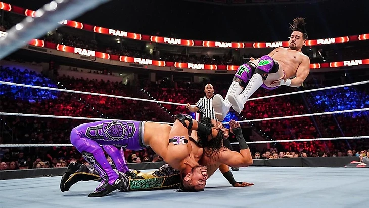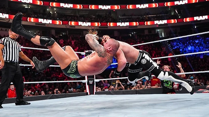 Риддл и Омос присутствовали в углах своих командных партнеров. Начался матч с хэдлока «Гадюки» и попытки сворачивания от Стайлза до 2. Ортон ответил собственным сворачиванием, но только до 1. В следующем эпизоде ЭйДжей начал работать над рукой противника, и тот ответил тем же, но «Феноменальный» дотянулся до канатов. Затем, загнав соперника в угол, ЭйДжей провел чоп, но чуть не нарвался на RKO… немного гляделок, и «Убийца Легенд» шарахнул суплекс, добавив серию коронных стомпов на конечности. Удержание до 2, и Рэнди разогнался, но Омос зацепил его ногу у канатов, пока судья проверял состояние Стайлза. Тем не менее, рефери быстро понял, что произошло, прогнав Омоса с рингсайда. Риддл спел ему «Goodbye!», за что получил жесткий апперкот. Пока «Гадюка» наблюдал за всем этим, Стайлз отправил его за пределы ринга, добавив удар предплечьем со слингщота и шоу ушло на рекламу. После нее мы увидели, что Рэнди попытался отбиться, но получил чоп блок и knee breaker.