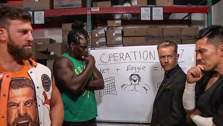 За кулисами Маверик обсуждал с Тозавой, Труфом и Гулаком подробности «Операции 24/7». План надежный, как швейцарские часы. На Реджи нужно скинуть сетку, и чемпионство будет отобрано. Поэтому Дрю будет отвлекать чемпиона, Акира просто будет ниндзей, а Труф сбросит сетку, когда Дрэйк подаст сигнал. И к приведению операции в исполнение они наступа.т прямо сейчас. Гулак тут же нашел Реджи за кулисами, стал ему втирать что-то про китайскую медицину, но в итоге Ар-Труф не вовремя скинул сеть, она упала на Гулака, и чемпион 24/7 в своем классическом стиле сбежал. А случилось все потому что Ар-Труф не совсем понял, по какому сигналу сбрасывать сетку. В ней Дрю, кстати, запутался и попросил помочь ему выбраться. Но Тозава его просто обнял, еле сдерживая слезы. А вообще, знаете, у Реджи офигенная работа. Быть каким-никаким чемпионом и делать то, что ты делал всю жизнь, и что никак не относится к рестлингу, в то время, как всю работу по придумыванию сюжетов и организации какой-никакой комедии за тебя сделают другие люди.
