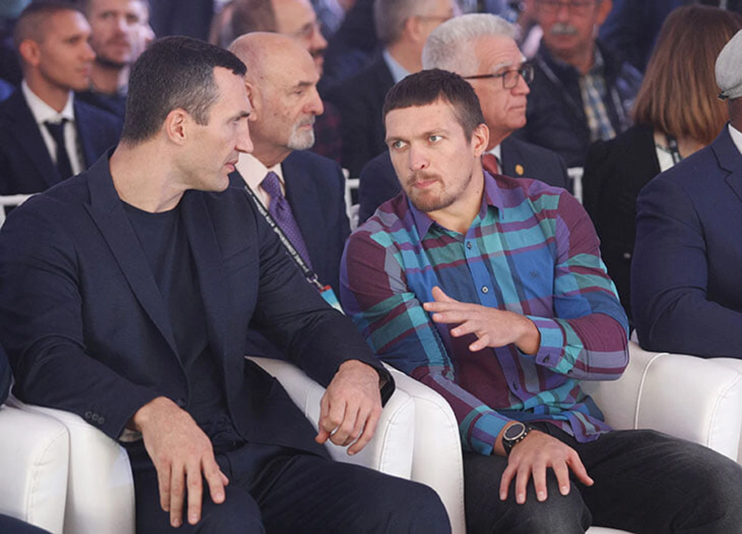 Ведущий намекнул на возможный переход Усика в тяжелый вес и поединке против Джошуа, и тут Усик начал расстреливать присутствующих инсайдами.