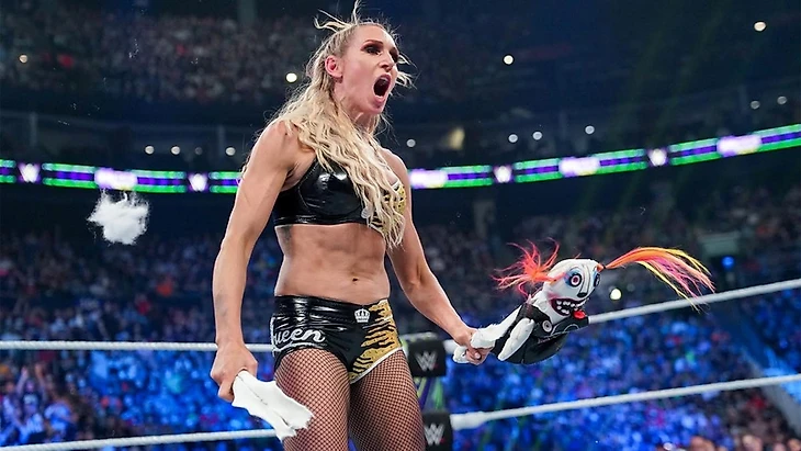 Мунсолт с угла Алекса встретила ногами, зарядив коронный сансет флип пауэрбомб, но и это титульную смену не принесло. От Twisted Bliss Шарли увернулась, но умудрилась провести еще одно сворачивание. DDT от претендентки! Но Флэр вовремя положила ногу на канат (не совсем, ну ладно). Блисс стала собираться на что-то еще, отвернулась, а Шарлотт взяла куклу Лили, которая в это время была на углу ринга. «Положь на место!» — что-то такое сказала Блисс, но Флэр просто бросила куклу в лицо сопернице, шарахнув биг бут. Впечатав Алексу в стойку ринга плечом, Флэр провела Natural Selection, и этого хватило для сохранения пояса. Но этим «Королева» была не удовлетворена. Она выкинула соперницу за пределы ринга, взяла Лили… и стала рвать ее на куски под не очень одобрительную реакцию толпы, приговаривая что-то про «тупую куклу». Блисс увидела это, разозлилась, налетела на все еще чемпионку, нанесла серию ударов, и Шарлотт сбежала за пределы ринга, где получила еще и Тез Пресс с апрона, но отбилась, направила Блисс спиной в апрон и перекинула через комментаторский стол. Флэр покинула арену, а раздосадованная Алекса немного поистерила, добралась до своей куклы и под чанты «Thank you, Lilly!» стала собирать то, что осталось от некогда подруги… А потом стала немного сходить с ума. Под конец разревелась даже. Но публика ее поддерживала хотя бы.