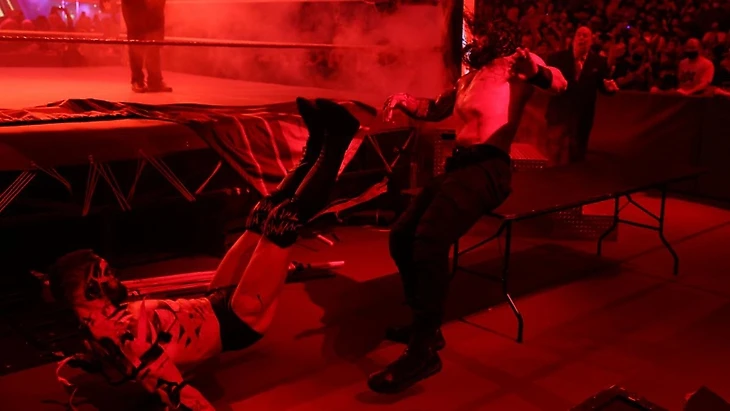 Затем Рейнс отправился еще и на свидание со ступеньками за пределами четырехугольника, был впечатал в баррикаду, и Балор вытащил наконец стол, закинув его в ринг. Роман прилетел в него своим Drive By дропкиком из неоткуда, и отправился вместе с соперником в зрительский зал, предварительно надев маску, которую ему дал Пол Хейман, ибо меры предосторожности необходимы. Наконец «Демон» отправился в полет через стол на панели кик-офф. Забравшись на этот же стол вместе с оппонентом, чемпион хотел провести uranage, но Финн отбился Кавада киками, сбросил «Вождя Племени» и провел кроссбади, прямиком на стол, который стоял рядом. Избивая визави, ирландец вернулся с ним обратно на рингсайд, а потом и в ринг. Тут Роман попытался помешать установить стол, получил Final Cut, но все-таки получил Uranage на стол, прямо как Монтез Форд на недавнем SmackDown. Удержание только до 2, и Рейнс приготовился к Супермэн Панчу, который цели не достиг. Серия ударов от Финна. Апперкот от Рэйнса! Пеле от Финна! Супермэн Панч от Романа! Для победы, правда, и этого оказалось мало. Гарпун Балор встретил киком, провел Слингблэйд, но шотган дропкик был встречен гарпуном! Удержание, и «Демон» вырвался, причем так вырвался, что еще и удар ниже пояса провел.