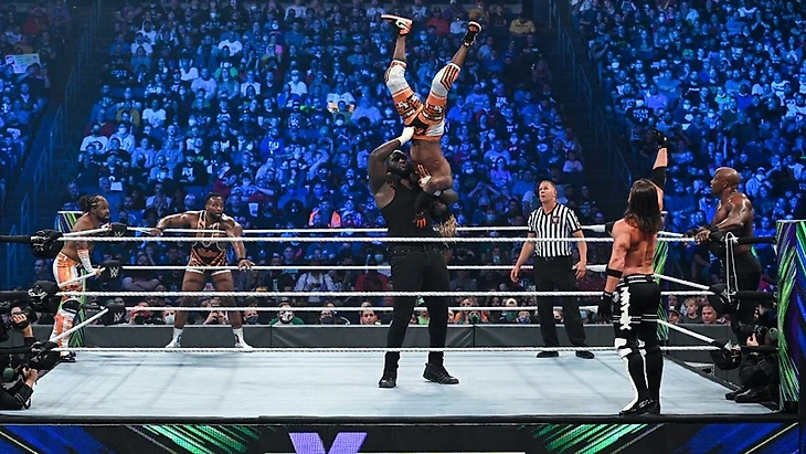 По очереди Омос, Стайлз и Лэшли избивали самого титулованного представителя команды соперников, и в какой-то момент ЭйДжей почувствовал себя так уверенно, что атаковал Вудса на апроне, подарив Кофи драгоценные секунды на восстановление. «Лидер Кофимании» поймал «Феноменального» двойным стомпом, получив шанс для передачи тэга… но Стайлз передал тэг Лэшли быстрее. Кофи увернулся от атаки, так что «Всемогущий» улетел за пределы ринга, где он стянул с апрона и атаковал Биг И, не позволив тому принять тэг. По возвращении в четырехугольник, Бобби еще немного помучил Кингстона, но тот ушел от Dominator, провел пару киков… но сам не заметил, как оказался в углу оппонентов, продолжив страдать. Снова уйдя от слэма Кофи наконец передал «горячий» тэг Вудсу, и тот принялся уничтожить Лэшли страйками, добавив шотган дропкик в углу. С первого раза DDT не прошел, и тогда Экзевьер нашел момент для слингшот Tornado DDT до 2. Еще один выход на DDT Бобби перевел в пауэрслэм, но только до 2. От суперплекса член Нового Дня отбился, шарахнул миссл дропкик, и составы снова сменились, на этот раз на Биг И и Стайлза. Чемпион WWE провел пару оверхэд белли-ту-белли, параллельно сбрасывая Омоса с апрона. Классический белли-ту-белли, Big Splash, но попытку Big Ending Стайлз встретил серией страйков.