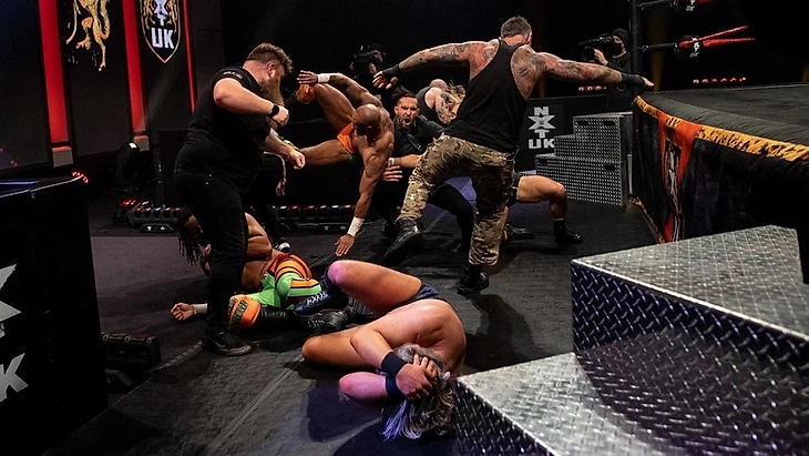 В начале матча инициатива переходила от одной стороны к другой: то Усатая Гора проведут какие-то приёмы, то афро-англичане начнут заламывать руки оппонентам. В дальнейшем Смит смог провести снейк айс на ноги Картера, однако вскоре получил серию приёмов от Трента и сентон бомб от Тайлера с плеч его командного партнёра, но Эштон смог быстро перевести приём в неудачное сворачивание. Последовало парочка командных приёмов от Смита и Картера, но Бейт таки смог контратаковать, что в дальнейшем позволило теперь уже Севену провести сентон с плеч чемпиона Кубка Наследия NXT UK. Далее Картер смог избежать и Seven Star Lariat и командный финишер от Усатой Горы и в ответ провёл scissors kick и мунсолт. Последовала попытка командного приёма от Эштона и Оливера, но Тайлер среверсировал его в сворачивание. Примерно в это время к рингу вышли участники Симбиоза. Бейт пытался провести Tyler Driver '97, но был выкинут Эштоном за ринг. Трент сразу же подскочил к напарнику, чтобы защитить от Симбиоза, но тех со спины атаковали Джек Старз и Дейв Мастифф. Начинается массовая драка, на которую дайвы за ринг проводят афро-англичане, после чего закидывают на ринг Тайлера и проводят ему ассистед суперкик, но этого оказывается недостаточно. Идёт попытка ещё одного командного приёма, но Оливера с ринга вытаскивает Севен и проводит ему драгон суплекс. В это же время Смит получает немецкий суплекс с апрона на ринг от Бейта, после чего Усатая Гора добивает его командным финишером.