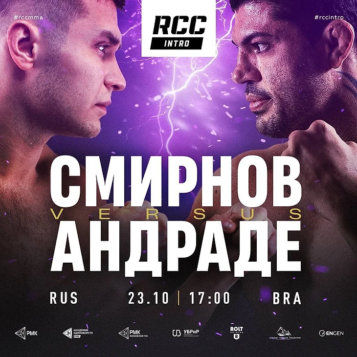 Арсений Смирнов (10-1) проведет бой против Вискарди Андраде (22-9) в главном событии турнира RCC Intro 17, который состоится 23 октября в Екатеринбурге на арене Академии единоборств РМК.