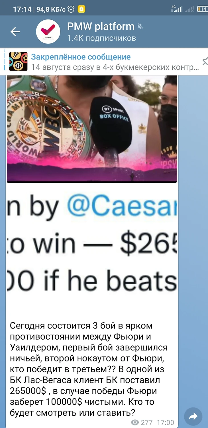 Сегодня состоится третий бой в ярком противостоянии между Фьюри и Уаилдером, напомним первый бой закончился ничьей, второй нокаутом от Фьюри. Нужно добавить, что Фьюри до сих пор не знает поражений. На кону стоят миллионы контрактных долларов и ещё столько же крутится в мире ставок. По данным портала PMW , в одном из казино Лас-Вегаса на победу Фьюри поставили 265000$ - это пока крупнейшая ставка из всех о которых известно. Ваши прогнозы?