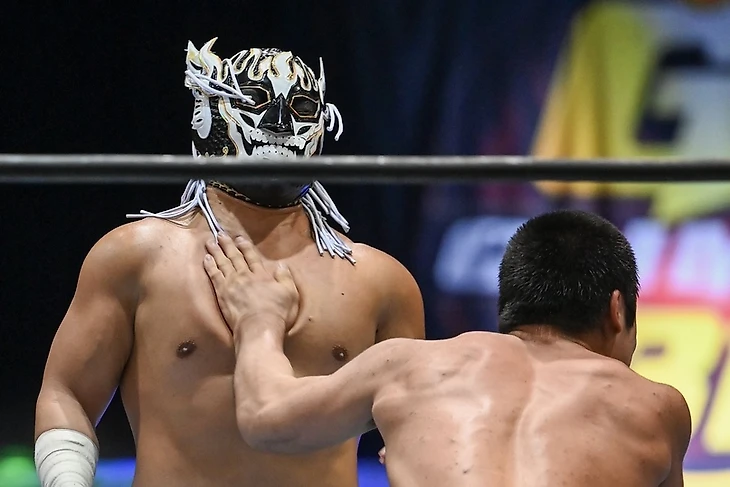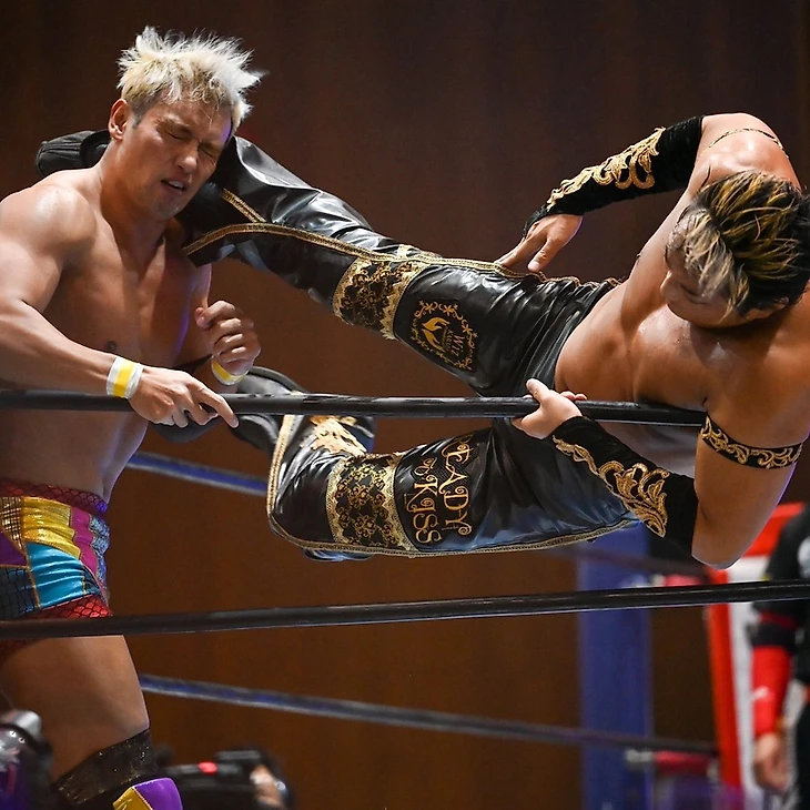 Михо Абе сопровождала «святого императора». Он с Окадой встречался трижды: в 2008 году Казучика проиграл свой дебютный матч, а в прошлом году победил Таичи дважды — на New Beginning и G1 Climax 30. Начинать рестлеры не торопились, и первый лок-ап мы увидели спустя почти полторы минуты после гонга. Исполнители оказались у канатов и клин-брейк последовал, после чего Казучика прервал кик и применил хэдлок. Еще немного чейн-рестлинга от Окады, но Таичи вернулся с помощью коронного «греко-римского захвата», отправившись с оппонентом за пределы четырехугольника. Казучика реверсировал запуск в ограждение, так что именно спина Таичи пострадала от контакта с металом, а Окада добавил еще и DDT. «Рэйнмэйкер» попытался вернуть визави в ринг, но тот отбился, направив многократного чемпиона мира в баррикаду, а потом сделал это еще раз, придушив Окаду кабелем. Затем командный чемпион IWGP снял маты на полу и провел недругу DDT. Действо вернулось в четыре угла, и Таичи начал доминировать, но накнец Казучика разозлился, начав отвечать ударами… только чтобы вновь быть придушенным. Удержание судья отказался отсчитывать, ибо «император» душил оппонента. Таичи заявил, что это было не удушение, схватив Окаду за горло двумя руками, чтобы показать, что такое удушение в его понимании. В углу, правда, Казучика наконец отбился, и через мгновение поймал визави флэпджеком. Немного реверсов, и Казучика провел еще и слайдинг бэк элбоу, а потом коронную связку из локтя и DDT из угла, но для победы этого было мало. Томбстоун Таичи заблокировал, поймал Окаду хук киком, добавив к нему лэриэт в углу и РК в спину. Еще несколько киков, которые Казучика прочувствовал, но попросил еще, заблокировав один из них. На бут Таичи ответил гаменгири в углу, проведя еще и кик в голову. Суперкик Окада избежал, получив nodo otoshi до 2. Казучика ответил Money Clip.