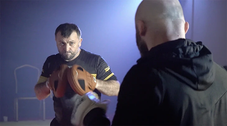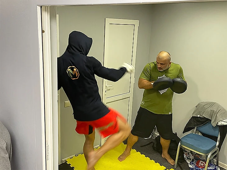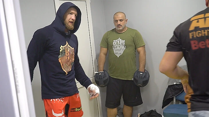 Минеев в это время был перекрыт в раздевалке, а снаружи всегда стоял человек, который контролировал, чтобы не зашел никто лишний. Если Мага был хоть и спокоен, но максимально сосредоточенный, то у Владимира была другая атмосфера. Периодически он шутил, улыбался, а параллельно – активно прорабатывал борьбу и раскидывал удары ногами. Исмаилов активно работал на лапах с братом Рамазаном, визуализируя резвые комбинации на руках.