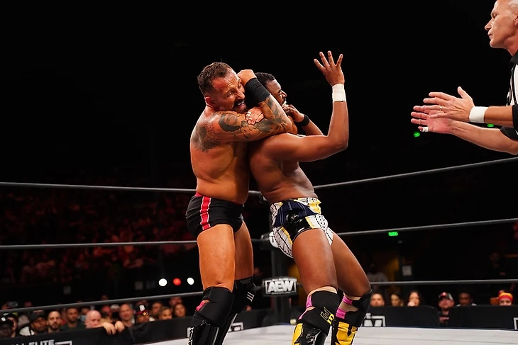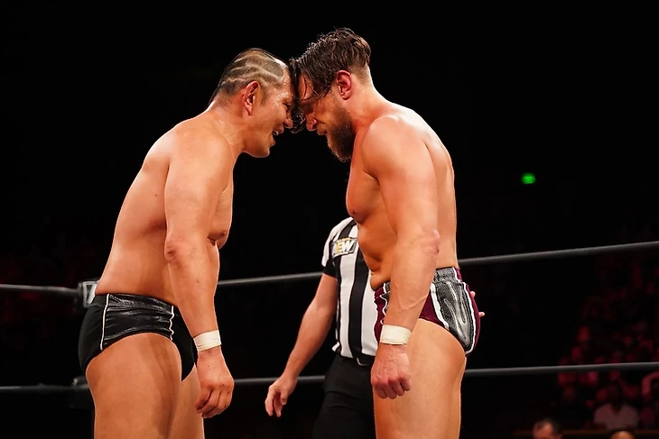 Естественно, обеих легенд фанаты встретили очень тепло. Гонг прозвенел, и рестлеры не особо спешили начинать активные действия, присматриваясь друг к другу под чанты «AEW!», «This is Awesome!» и «This is Wrestling!». Далее начался чейн-рестлинг, борьба на настиле, но опять же, никто не захватил преимущество. В следующем эпизоде Дэниелсон сумел провести вариацию dragon screw, кик в колено, но Сузуки просто «впитал» все это под чанты «Si! Si! Si!». Минору оттолкнул Брайана, за что получил апперкот. Чоп от японца, и он предложил открытый размен ударами. Американец провел кик в грудь. Сузуки ответил еще одним чопом. Еще один жесткий кик от Дэниелсона, от которого Минору аж отбросило… но он шарахнул коронный удар предплечьем в голову, вырубив «Американского Дракона». Фанаты стали чантить «Holy Shit!». Дэниелсон поднялся на ноги, осыпал противника киками, провел целую кучу ударов локтем куда-то в плечо, но от болевого Сузуки убежал на апрон. Брайан, естественно, совершил классическую ошибку, решив атаковать оппонента тут, попав в Suzuki Armbar. Действие переместилось на рингсайд, где «Король» продолжил обрабатывать визави, направив его еще и в рингпост. Рестлеры вернулись в четырехугольник, где Минору применил сначала один болевой, затем второй, поработав, наверное над всеми суставами, которые есть в руке. Дэниелсон дотянулся до канатов, и снова борцы оказались за пределами ринга, где Брайан реверсировал запуск в стойку ринга, так что именно Минору влетел в нее головой. Американец же добавил колено с апрона. Вернувшись в ринг, Брайан провел кик в корпус, но Минору выдержал его.