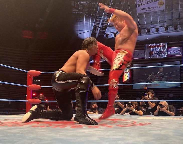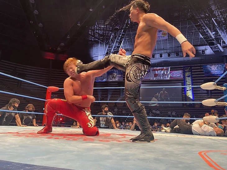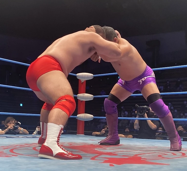 — Перед началом матчей, шоу открылось кратким превью по ключевым титульным противостояниям. Также не забыли и о побочных матчах, назначенных в самый последний момент. Впоследствии кард повторно огласили для зрителей и телезрителей телеканала Samurai TV. Оупенером же всего шоу выступил бой между Рюджи Хиджикатой и Рёмой Тсукамото. И если последний является одним из выходцев нынешнего состава учеников AJPW Dojo, то вот Хиджиката-сан любопытный кард. Он выходец из промоушена Fighting Investigation Team Battlarts и один из самых видных юниоров AJPW последних 20 лет. Рюджи выступал в AJPW в периоды с 2000 по 2010 гг., с 2013 по 2016 гг. и начиная с 2020 года по настоящее время. Одним из интересных фактов является то, что он в своё время знатно гонял и побеждал на ринге ныне топ-рестлера NJPW и ученика Тошиаки Кавады - да-да, нашего любимого "Святого Императора" Таичи. Плюс в качестве достижений у Хиджикаты есть тайтл-рейн как мирового чемпиона AJPW в полутяжёлом весе в период с апреля по сентябрь 2008 года (он стал чемпионом после боя с Сильвер Кингом, защитил титул от Каза Хаяши, КАЯ и Эль Самурая, а проиграл титул Наомичи Маруфуджи). Такой вот породистый ветеран достался молодому льву AJPW, правда Тсукамото проиграл Хиджкате, пусть и после упорного сопротивления (Личная оценка - 2.);
