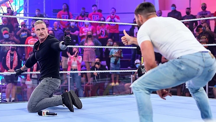 Нам показывают по промо от Грейсона Уоллера и ЭлЭй Найта. Каждый из них заявляет, что должен быть хостом предстоящего специального еженедельника, и по поводу этого между ними сегодня был назначен матч.