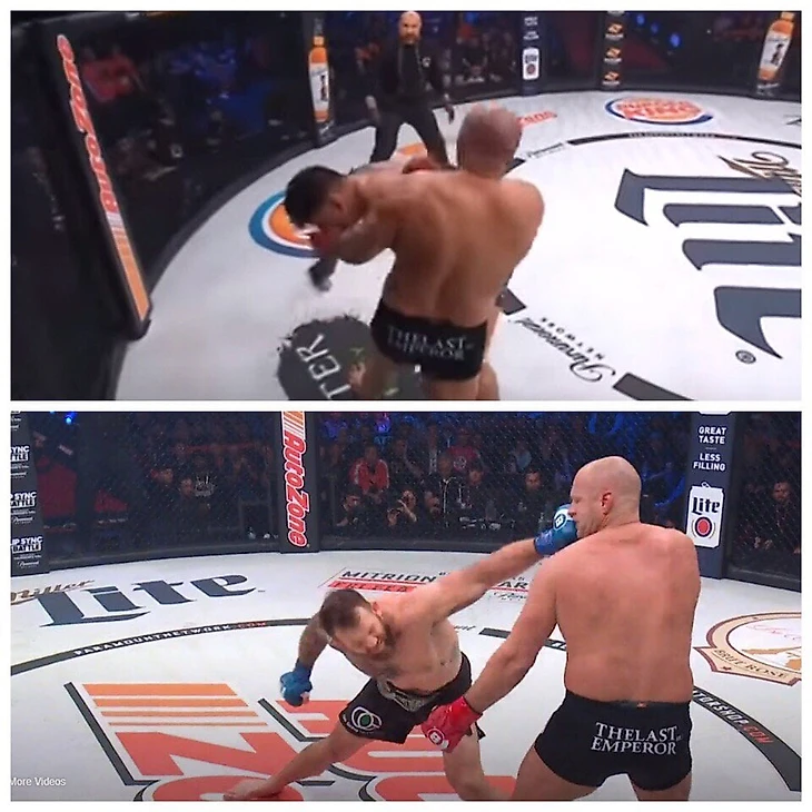 К примеру, абсолютно идентичные ситуации против Фрэнка Мира и Райана Бейдера. Просто первого Федор выключил за 48 секунд, отойдя от размашистого панча на пару сантиметров дальше и выставив апперкот, а от другого упал за 35 – чутка не успев.