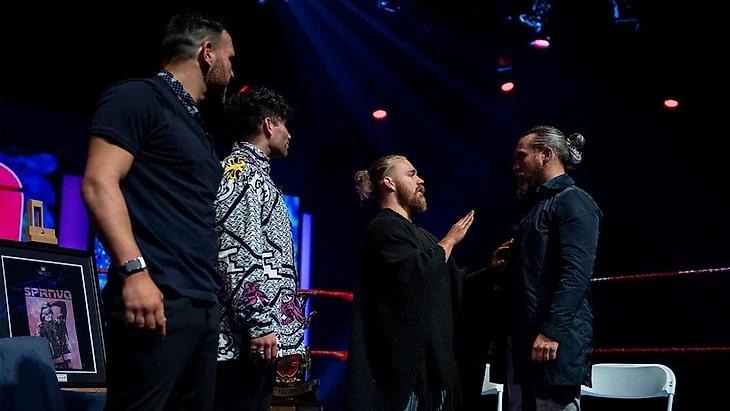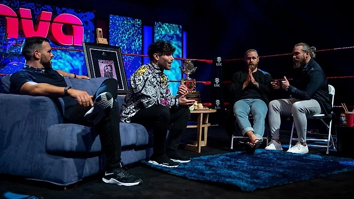 Нам сходу анонсируют не только сегодняшний мэйн-ивент, но и, ВНЕЗАПНО, возвращение всеми любимых Supernova Sessions, гостем которых во второй раз станет Тайлер Бэйт в женской шали, жующий траву с пола. А пока что - первый матч вечера.