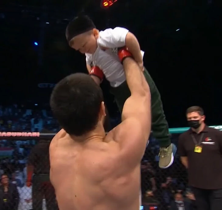 После победы Махачев поднял на руки Хасбика – блогер приехал в Абу-Даби, чтобы поболеть за бойца. А после сфотографировался с Хабибом и командой (Хасбик же перекочевал на руки Нурмагомедова).