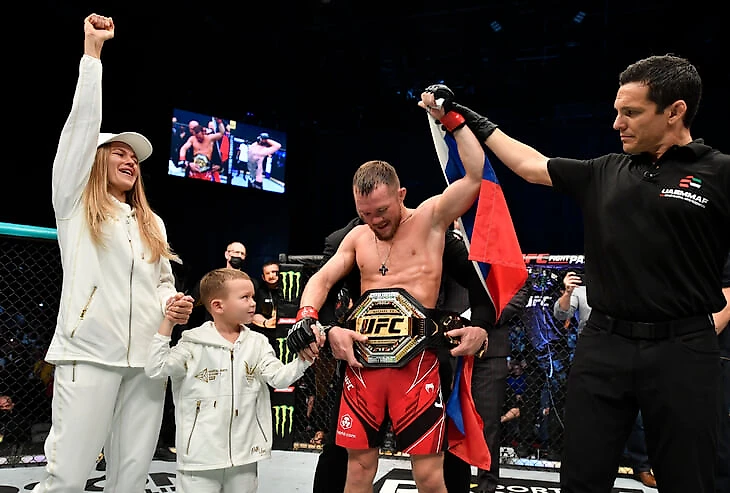 Первыми с победой и титулом Петра поздравили родные: жена Юлия и сын Даниил были в Абу-Даби и зашли в октагон сразу после окончания поединка.