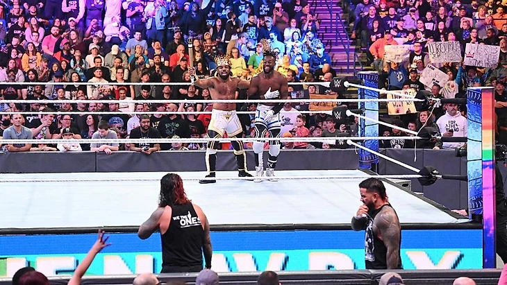 Кофи потребовал внимание к словам Вудса, и «Король» поприветствовал публику, а потом Кингстон завел жителей Пенсильвании на чанты «Hail, King Woods!». Сам Экзевьер напомнил нам, что неделю назад состоялась церемония коронации, по ходу которой Кофи надел на его голову корону, сделав того королем официально. Но всем известно, что сила королей определяется их свитой. Положительные стороны Кофи всем известны: у него золотое сердце, и он самый надежный соратник Вудса. Поэтому тот решил наградить его высшей честью. Кингстон приклонил колено. «Король» выразил надежду, что смелость и преданность, свойственные Кофи, станут отличным примером для всех остальных подданных королевства «Вселенная WWE». И Вудс посвятил его в рыцари, назвав того «Сэром Кофи Кингстоном», После этого бывшему чмпиону WWE даже брошь «десницы короля» надели с единорогом. Все были счастливы, но вдруг на арене появились Джимми и Джей Усо. «Снова к этому пришло: Усо и Новый День» — начали свою речь командные чемпионы. Вудс и Кофи считают себя королем и правой рукой короля?